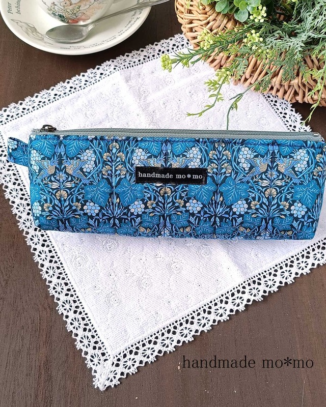 リバティプリントのタナローン生地とキルト芯を重ね、 生地の柄に合わせてオリジナルのキルティングを作り、 ふんわりやさしい手触りのペンケースに仕立てました。 この作品は対象にならんだ葉の真ん中に縫い目が来るように キルティングしました マチがあるのでたっぷり入ります。 ハサミも入りました。 ✿ 生地について この作品には、イギリス・リバティ百貨店のネットショップから取り寄せた生地を使用しています。 2025年8月、お客様と一緒にInstagramと公式LINEを通して選んだ特別な生地です。 国内未発売のリバティプリントの中から人気投票で選ばれた柄で、 ロンドンのリバティ百貨店から飛行機でやってきたお取り寄せ生地になります。 ✿ 使用したリバティプリント ヴァインシーフ いちご泥棒ではなく、「ぶどう泥棒」と呼ばれる柄です ぶどうならではの葉と鳥が描かれた、美しいデザイン。 リバティの香水ボトルにも使われている特別な柄なんです。 サイズ:たて約7cm×横約20cm マチ5cm 表のリバティプリント:ぶどう泥棒 内布:綿麻キャンバス きなり