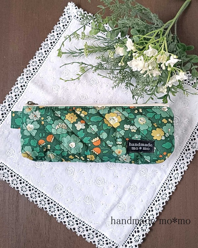 リバティプリントのタナローン生地とキルト芯を重ね、 生地の柄に合わせてオリジナルのキルティングを作り、 ふんわりやさしい手触りのペンケースに仕立てました。 この作品は花々の間に、ランダムな交差する波線を縫いました マチがあるのでたっぷり入ります。 18cmファスナーでペンケースとしてもゆったり入るだけでなく ふんわりしているので、メガネケースとしてもお使いいただけます。 ✿ 生地について イギリス・ロンドンにあるリバティ百貨店の ネットショップで購入し、飛行機でやってきた お取り寄せ生地を使用しています。 輸入リバティプリントです。 ✿ 使用したリバティプリント リバティ・ファブリックスのクラシックコレクションとしても特に人気の高い「ソープ」の縮小版です。1968年に制作された緻密で詳細なこの花柄は、1979年のリバティ初のクラシックコレクションに収録されたデザインのひとつです。 サイズ:たて約6cm×横約18cm マチ3cm 表のリバティプリント:ソープヒル 内布:綿麻キャンバス きなり