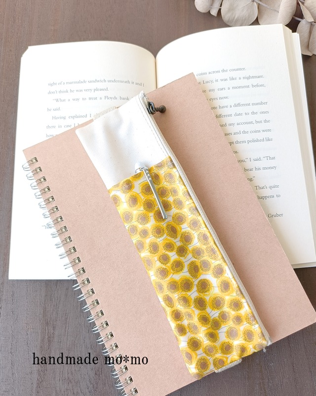 ゴムベルト付きでノートや教科書などにつけて持ち運びができる 便利なペンケースです。 (7枚目:A5/B5ノート) 表のリバティ柄部分がポケットになっているので よく使うボールペンなどはここにさしておくと 使いやすいです。 (2枚目) スリムタイプのペンケースと同じサイズです。 ボールペンやシャープペンなどが4本くらい入るサイズです。 表ポケットはリバティプリントのラミネート生地を使用しています。 タナローン生地に、つや消しでマットなフィルムを貼ってある生地で、さらっとした手ざわりです。 (5枚目ラミネート参考写真) 無地部分は有輪商店のオックス生地をつや消しラミネート加工した生地です。 やや厚手でしっかりしています。 (6枚目ラミネート参考写真) <作品に使用した柄について> リバティプリントには、1つ1つ名前と、歴史やテーマ、由来などのエピソードがあります。 この作品に使用した柄は、ザンジーサンビームといいます。 ひまわりがお好きな方に人気な柄です。 この柄の説明にはひまわりという表記はなく、黄金の光を放つ植物と書かれています。 明るい気持ちになる、素敵な柄です。 リバティ:ザンジーサンビーム 無地ラミネート:有輪オックス きなり 内布:綿麻キャンバス ハニーイエロー サイズ:約縦5.5cm 横20cm ※ファスナーは20cmです。