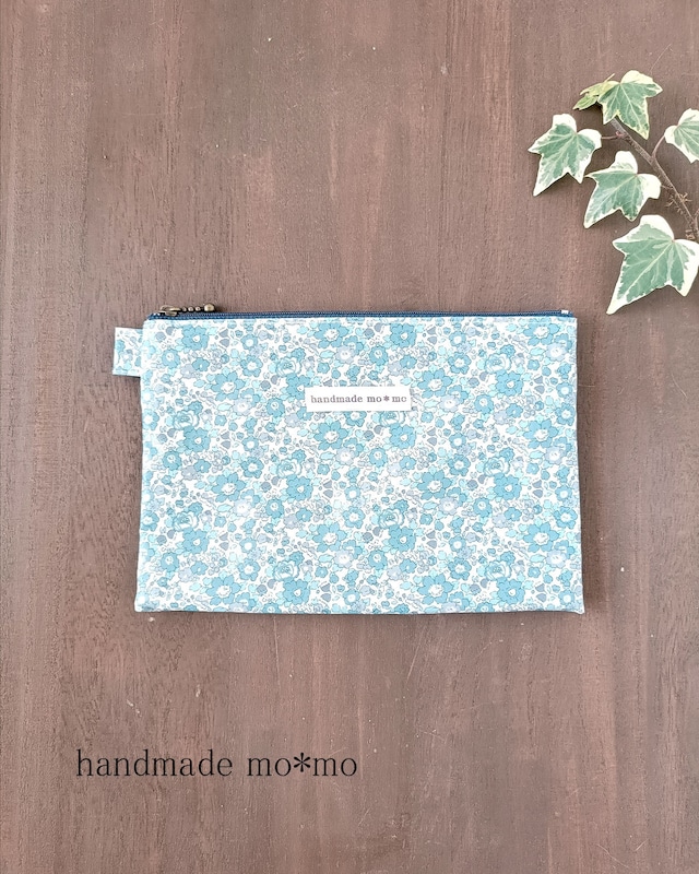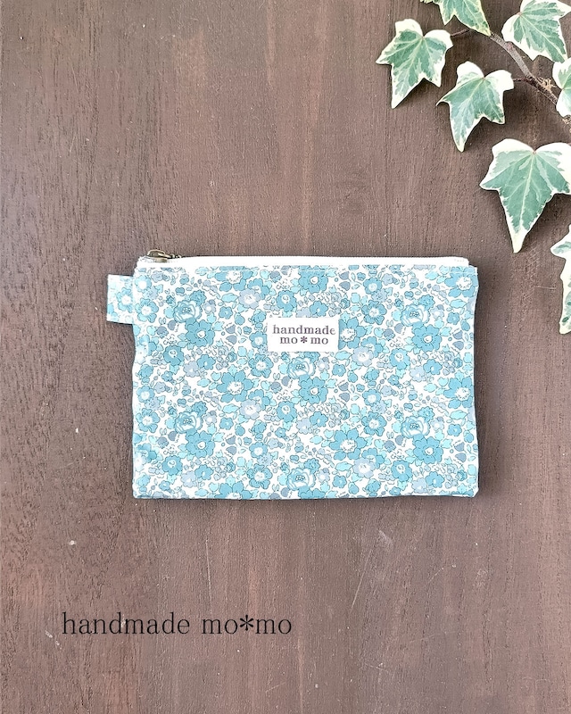 ポケット付きで便利なぺたんこポーチです。 ラミネート生地のポーチは、ほつれない分、内布がついていないものが多いです。 便利になるよう、内布をつけて、ポケットを充実させることにこだわりました。 <表生地について> ラミネートのリバティ生地を使用。リバティプリント定番の高級素材タナローンに、つや消しでマットなフィルムを貼り付けた、ラミネート生地使用。 汚れたら拭きとれます。除菌スプレーや除菌シートで拭けるのもうれしいですね。 コーティングしてありますが、やわらかく、さらっとした手ざわりが特徴の大好きな素材です。 (6枚目の写真参考) <内側について> 内布は、底の部分で表のラミネートリバティと縫い合わせています。 そのため、内袋があがってきて、ファスナーがかんでしまう、ということがほとんどありません。 ポケットは、片側はカードサイズですが、2~3枚入ると思います。 真ん中に仕切りがあるので、分けて入れられて便利です。 <その他のおすすめポイント> マチがないので、かばんに入れやすいです。 カードのポケットもあり、ミニ財布としても使えます。 5枚目:3つのサイズのぺたんこポーチを作っています。こちらの作品は一番小さいサイズです。 <作品に使用したリバティプリントの柄について> リバティプリント ベッツィ・アン は、 2013年秋冬コレクション最後のテーマ:リバティが誇る様々な花のスタイルを集約した 「センス・オブ・リバティ」の中の1柄で、1933年に制作され、 リバティのクラシック柄として有名な「Betsy(ベッツィ)」の縮小版です。 リバティプリント:ベッツィアン ジェイドグリーン 内布:綿麻キャンバス グレイッシュブルー サイズ:たて 約11cm 横 約14cm マチなし