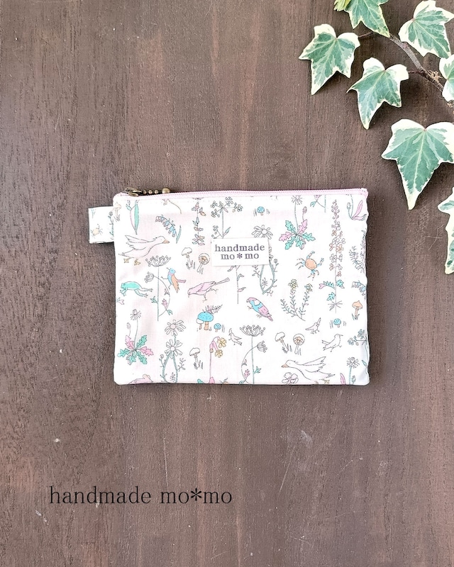 ポケット付きで便利なぺたんこポーチです。 ラミネート生地のポーチは、ほつれない分、内布がついていないものが多いです。 便利になるよう、内布をつけて、ポケットを充実させることにこだわりました。 <表生地について> ラミネートのリバティ生地を使用。リバティプリント定番の高級素材タナローンに、つや消しでマットなフィルムを貼り付けた、ラミネート生地使用。 汚れたら拭きとれます。除菌スプレーや除菌シートで拭けるのもうれしいですね。 コーティングしてありますが、やわらかく、さらっとした手ざわりが特徴の大好きな素材です。 (6枚目の写真参考) <内側について> 内布は、底の部分で表のラミネートリバティと縫い合わせています。 そのため、内袋があがってきて、ファスナーがかんでしまう、ということがほとんどありません。 ポケットは、片側はカードサイズですが、2~3枚入ると思います。 真ん中に仕切りがあるので、分けて入れられて便利です。 <その他のおすすめポイント> マチがないので、かばんに入れやすいです。 カードのポケットもあり、ミニ財布としても使えます。 5枚目:3つのサイズのぺたんこポーチを作っています。こちらの作品は一番小さいサイズです。 <作品に使用したリバティプリントの柄について> タマラ・ドゥ・ペオンによるデザインで、2015年のデザインですが、かわいい!と人気があり、この柄の作品をコレクションしてくださっているお客様が何人かいます。 絵本のような、かわいらしく、ほっこりするデザインです。 リバティプリント:セオ 内布:綿麻キャンバス クラシックピンク サイズ:たて 約11cm 横 約14cm マチなし