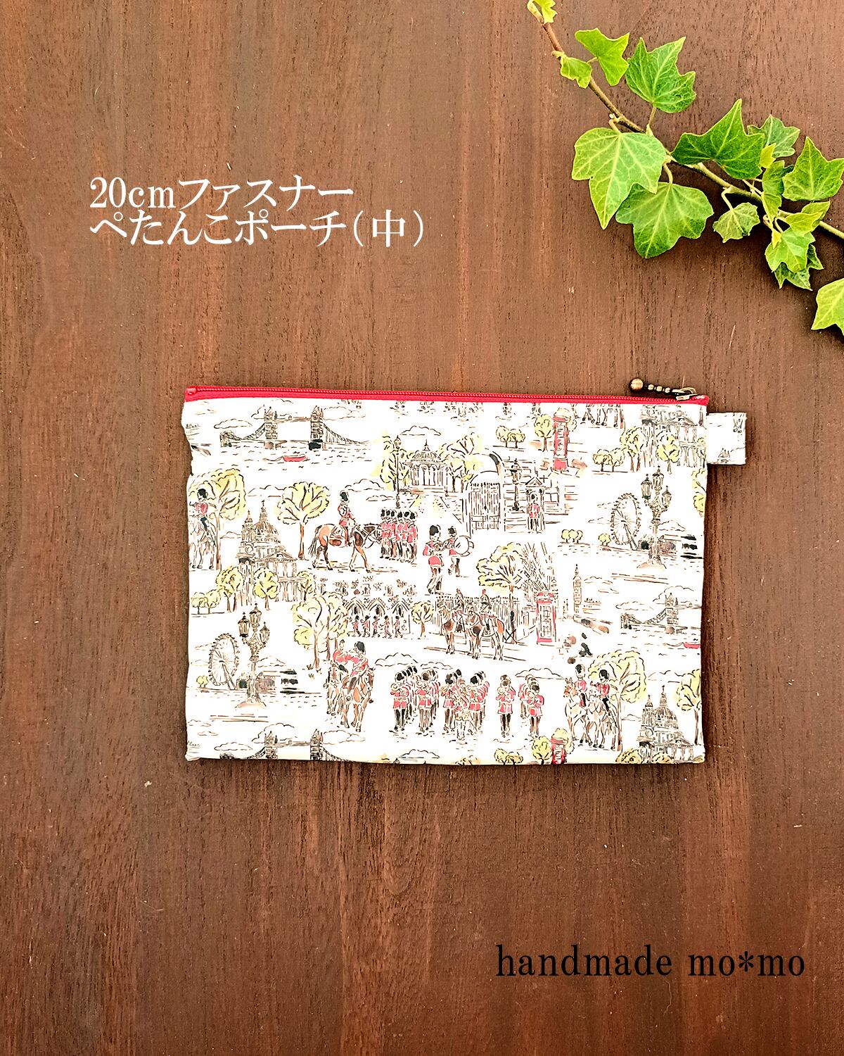 6枚目:3つのサイズのぺたんこポーチを作っています。こちらの作品は真ん中のサイズです。