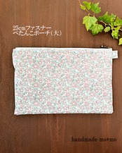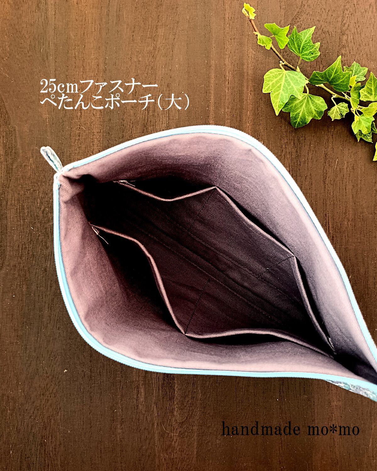 5枚目の画像:3種類のサイズのぺたんこポーチを作りました。こちらの作品は一番大きなサイズです。