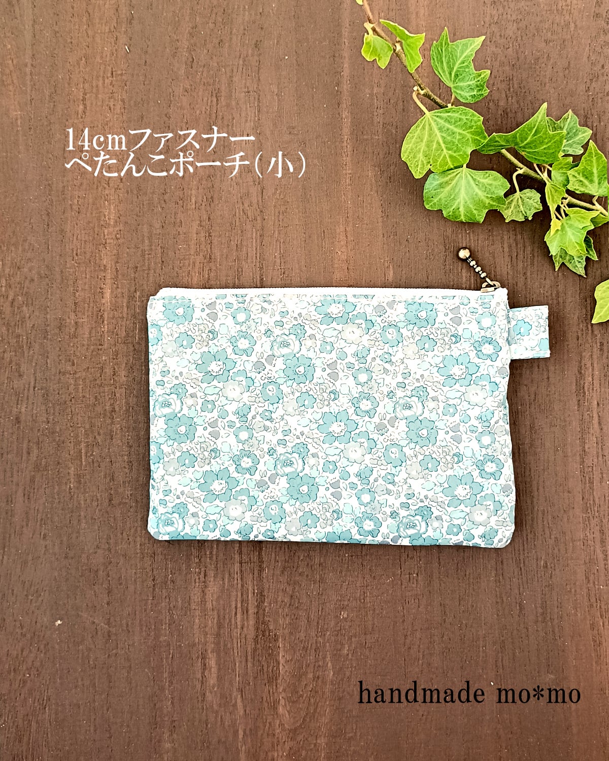 4枚目:3つのサイズのぺたんこポーチを作っています。こちらの作品は一番小さいサイズです。