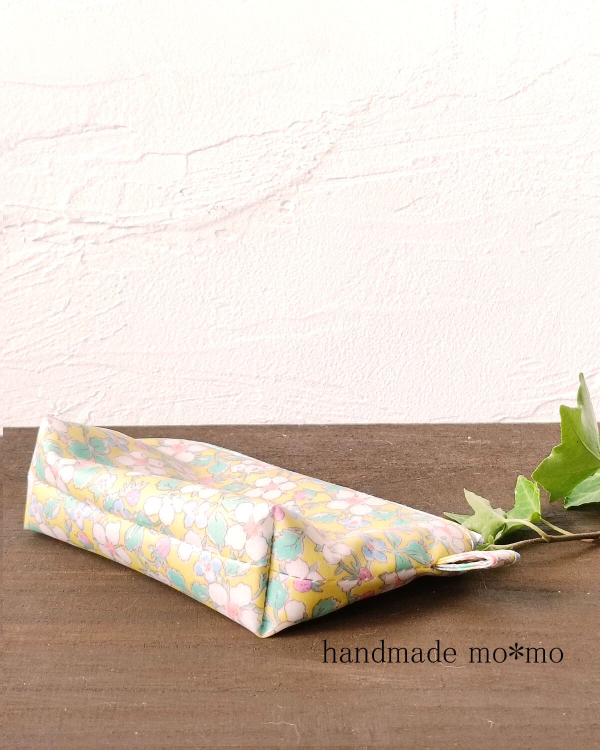 ラミネートのリバティ生地を使用。リバティプリント定番の高級素材タナローンに、つや消しでマットなフィルムを貼り付けた、ラミネート生地使用。