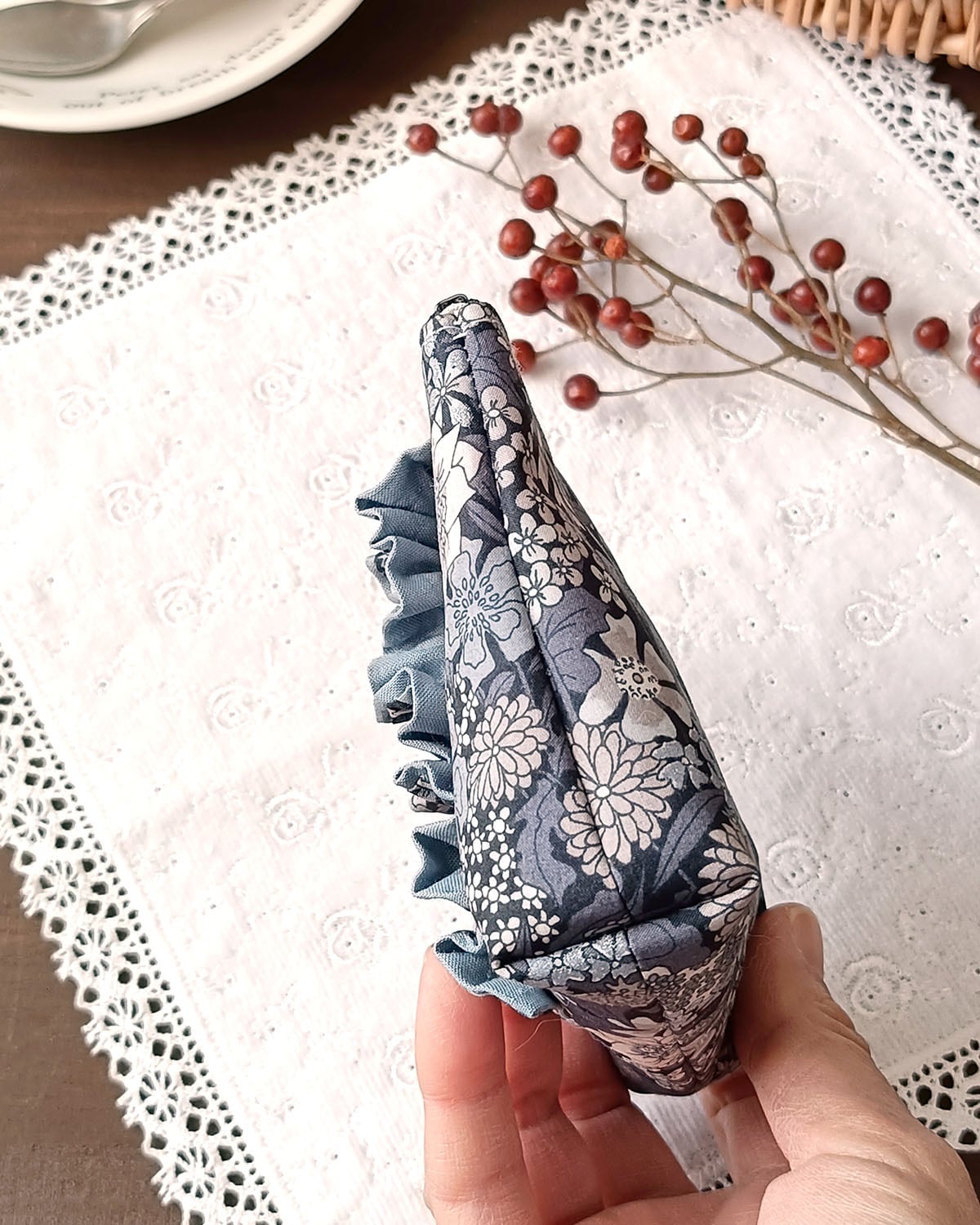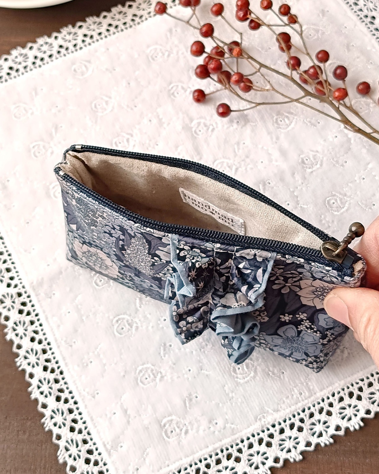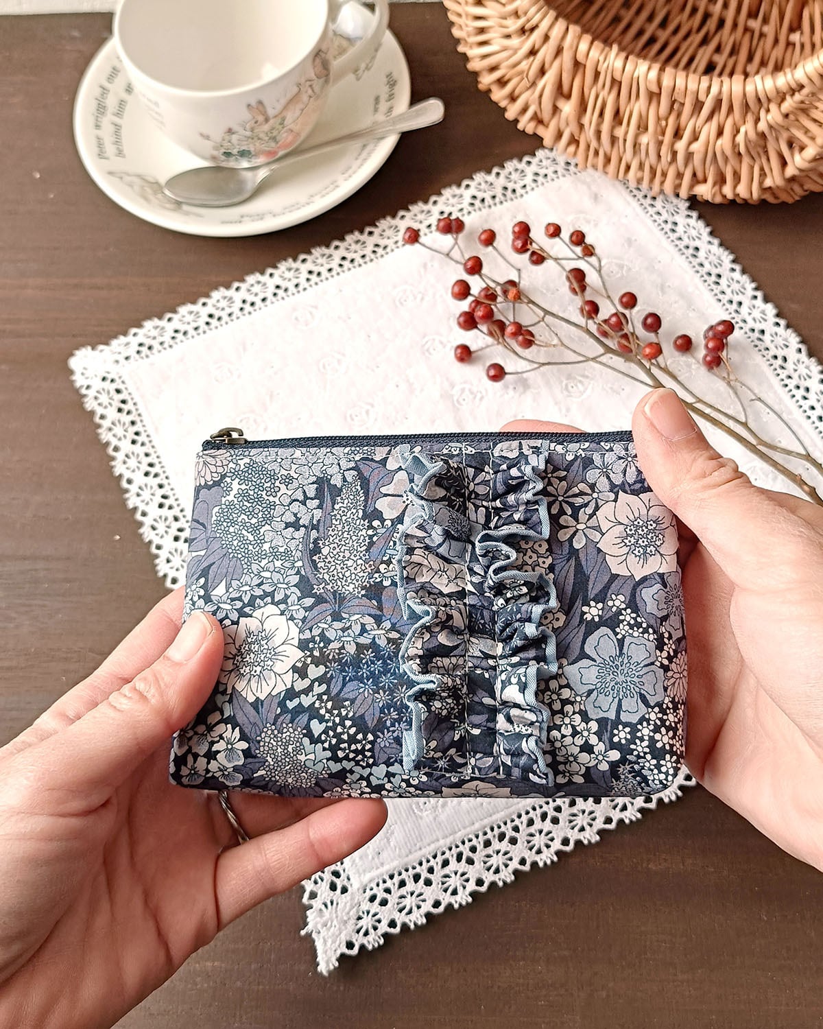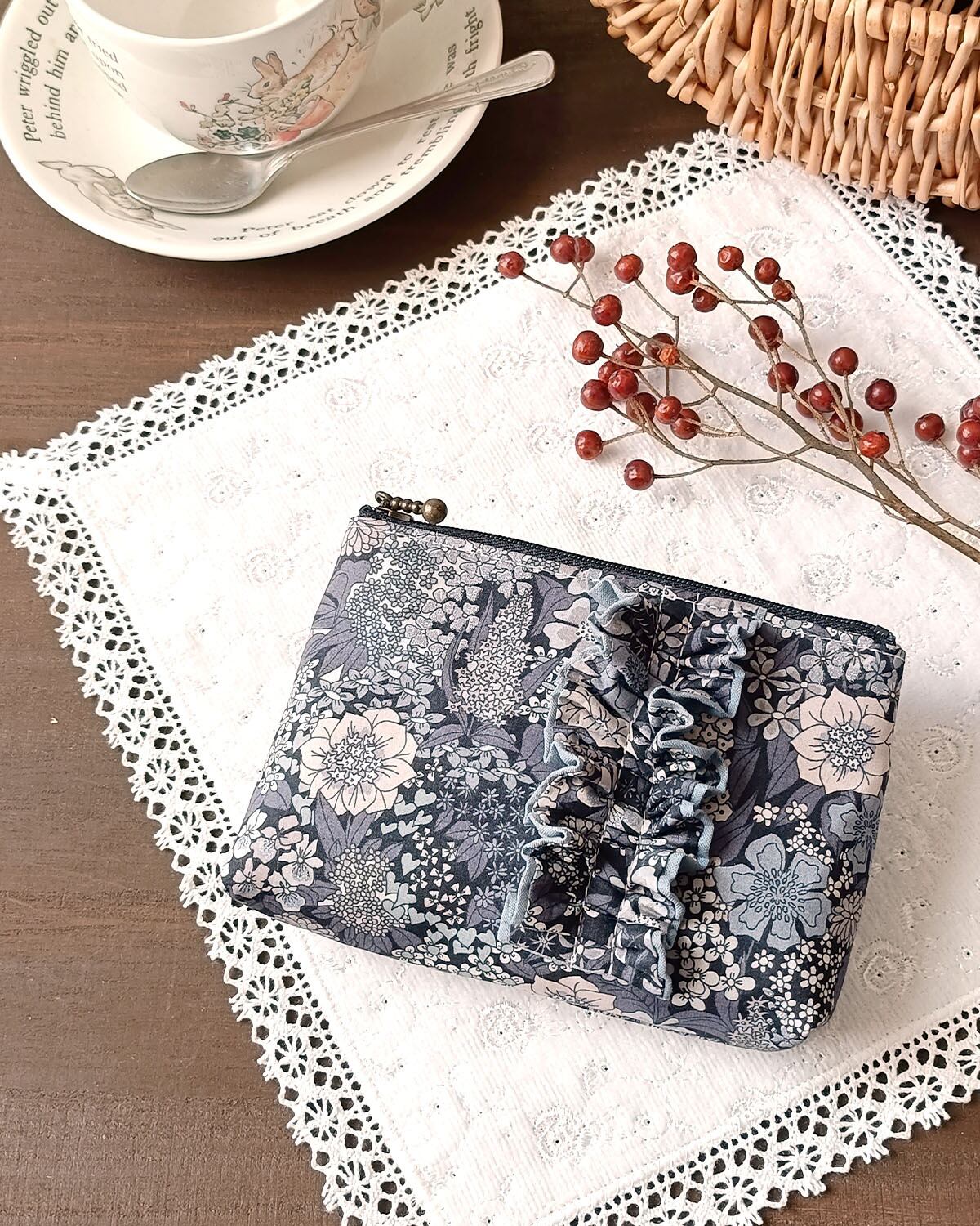 リバティのフリルが豪華で美しいポーチです。