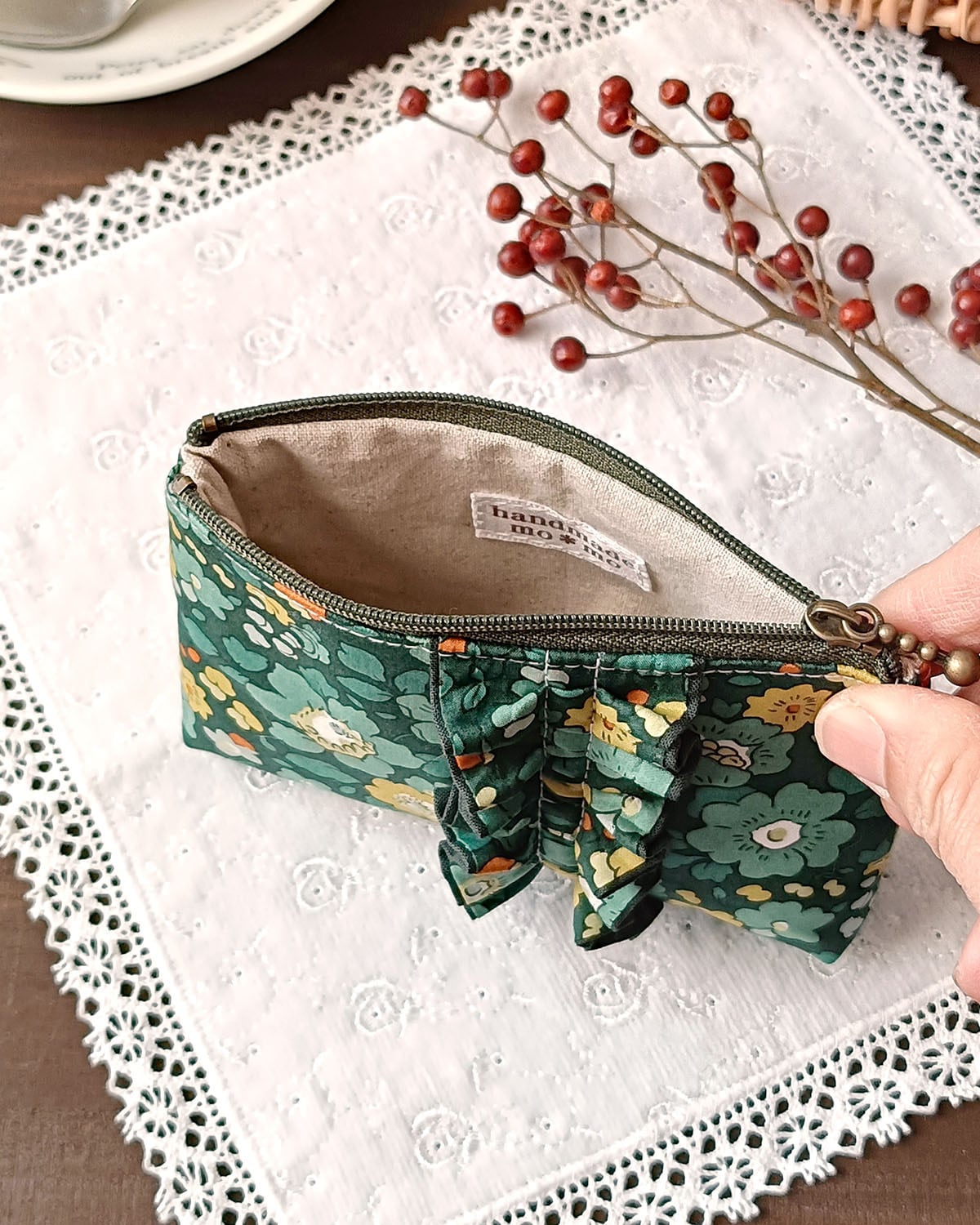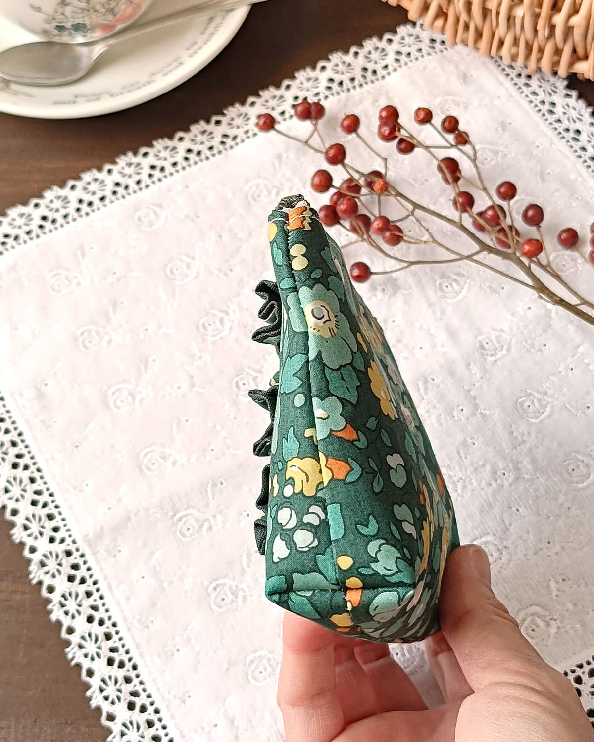リバティのフリルが豪華で美しいポーチです。