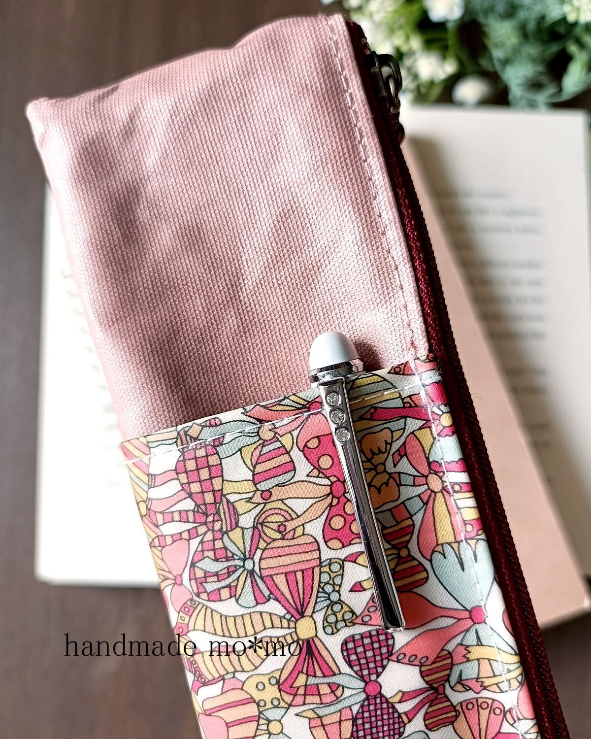 表ポケットはリバティプリントのラミネート生地を使用しています。