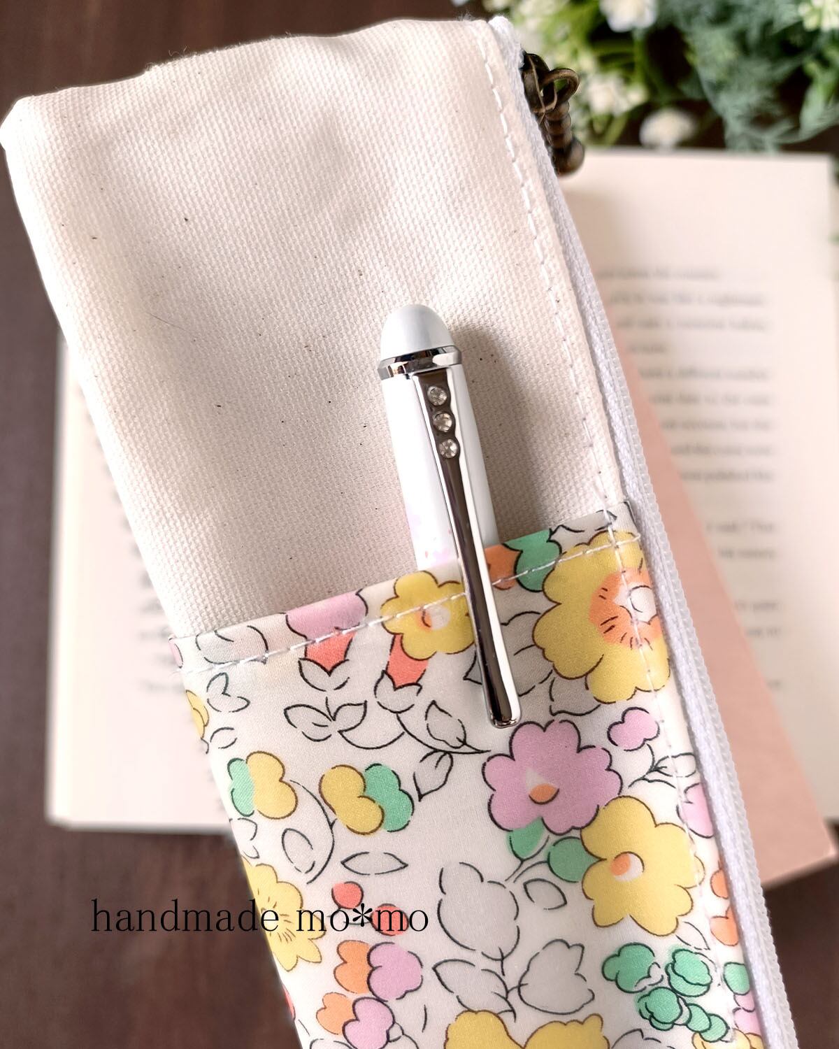 表ポケットはリバティプリントのラミネート生地を使用しています。
