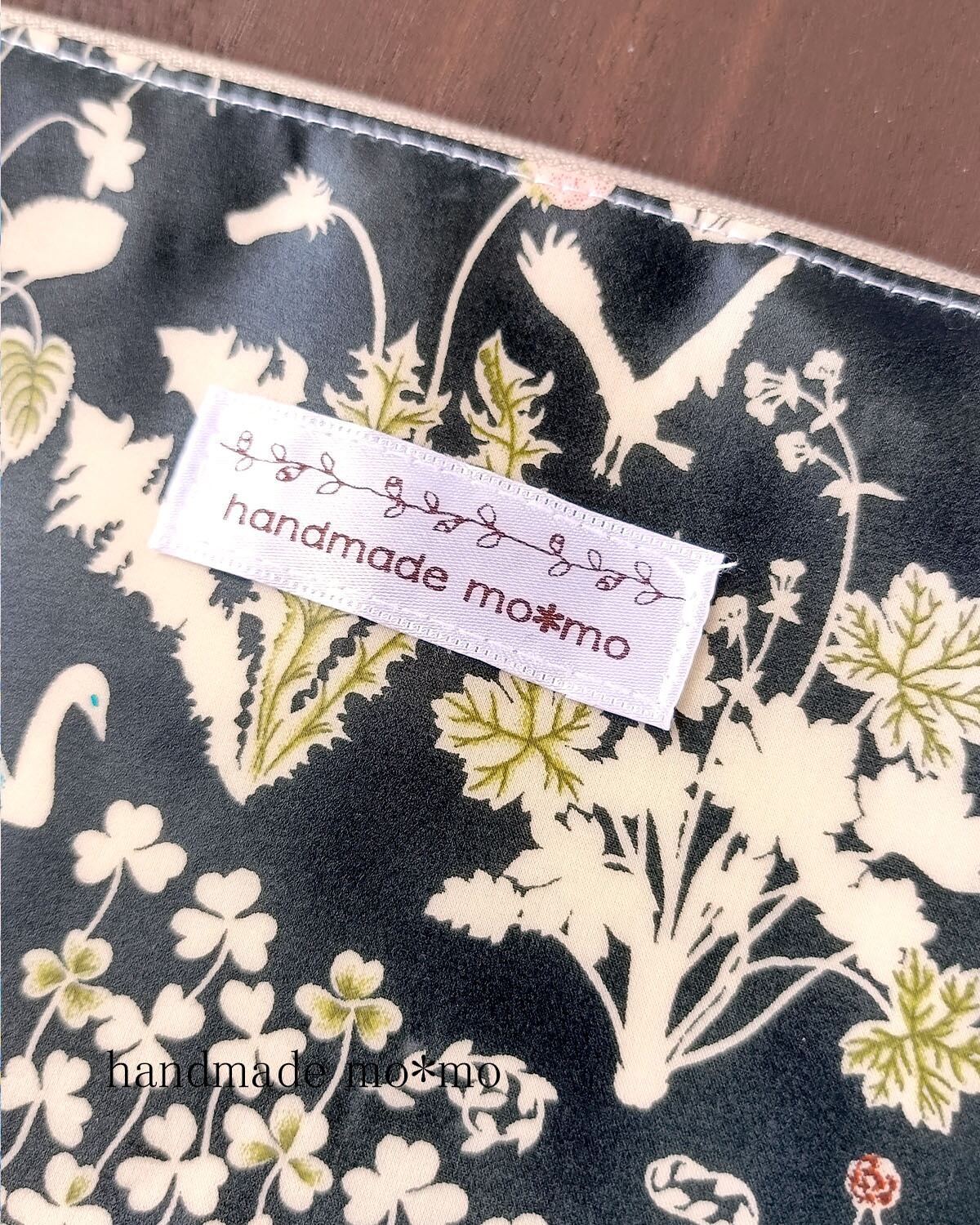 ラミネートのリバティ生地を使用。リバティプリント定番の高級素材タナローンに、つや消しでマットなフィルムを貼り付けた、ラミネート生地使用。