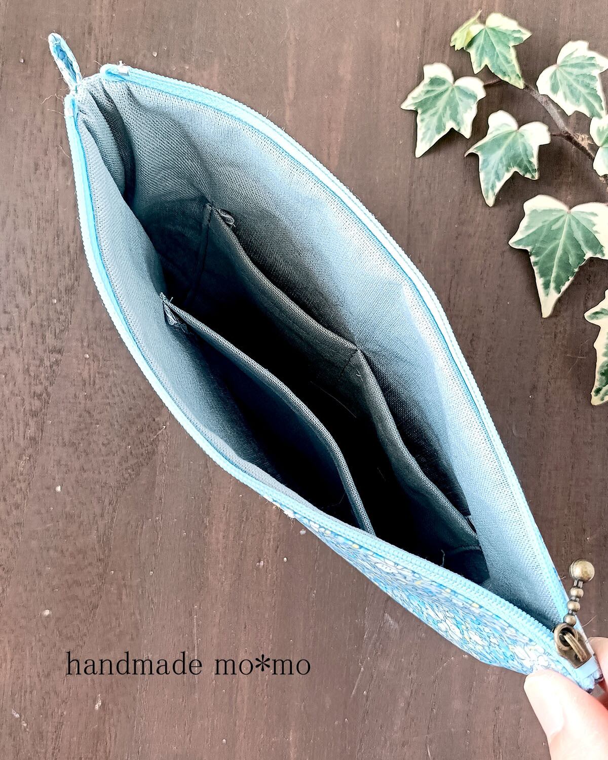 7枚目:3つのサイズのぺたんこポーチを作っています。こちらの作品は真ん中のサイズです。