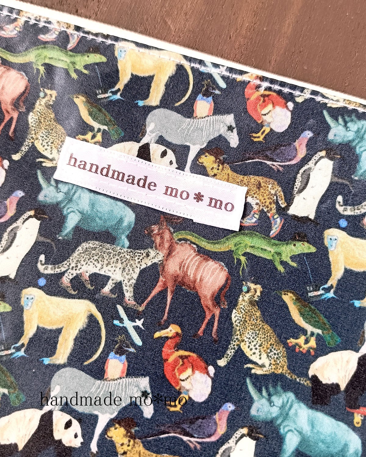 ラミネートのリバティ生地を使用。リバティプリント定番の高級素材タナローンに、つや消しでマットなフィルムを貼り付けた、ラミネート生地使用。