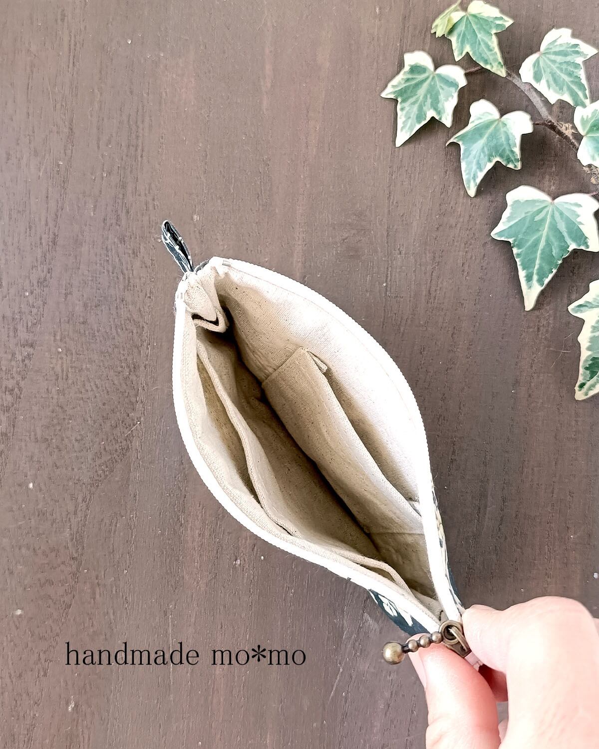 5枚目:3つのサイズのぺたんこポーチを作っています。こちらの作品は一番小さいサイズです。