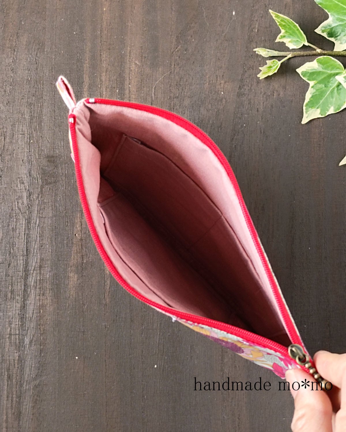 7枚目:3つのサイズのぺたんこポーチを作っています。こちらの作品は真ん中のサイズです。