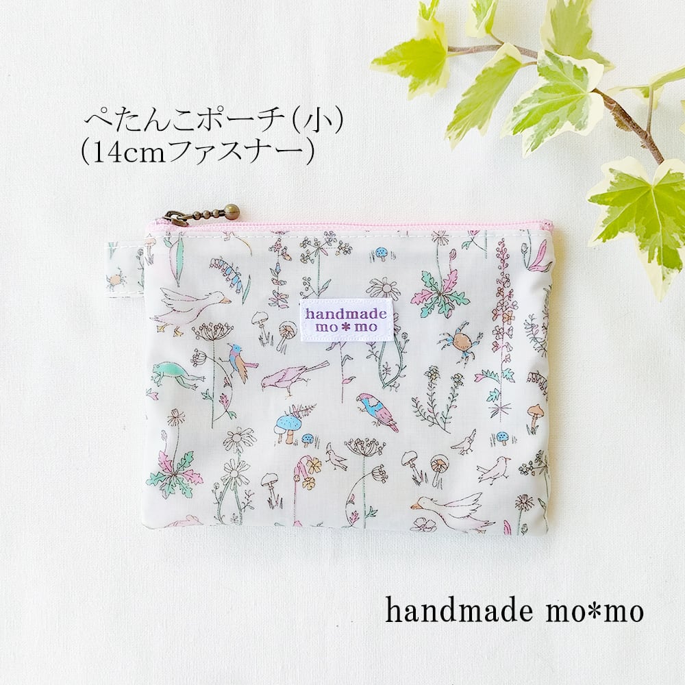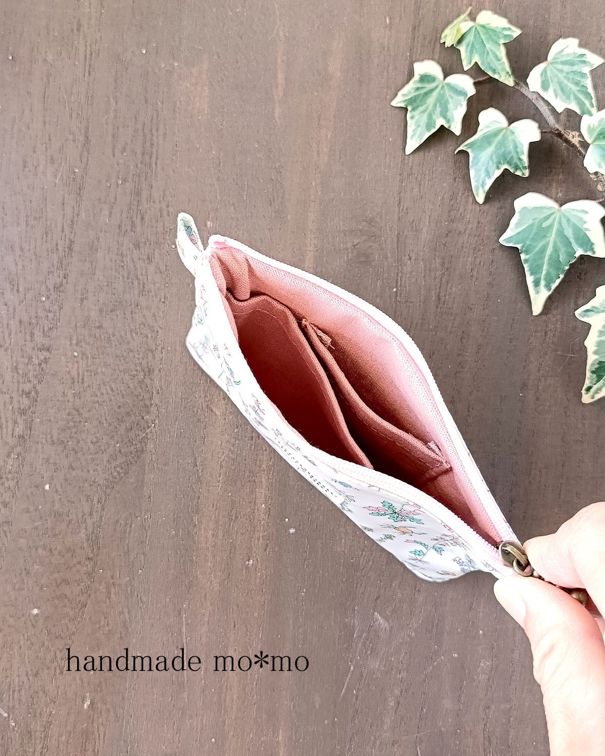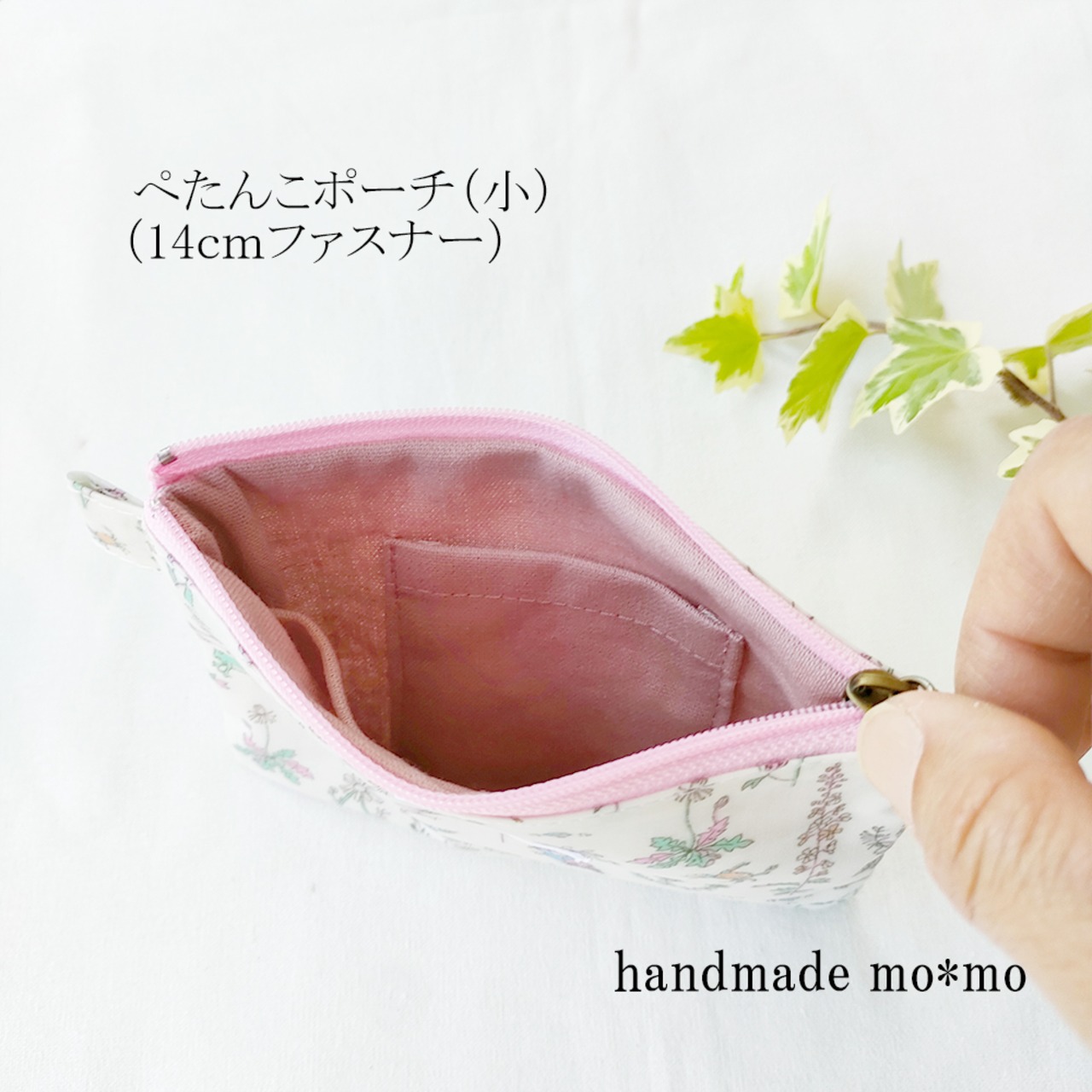 5枚目:3つのサイズのぺたんこポーチを作っています。こちらの作品は一番小さいサイズです。