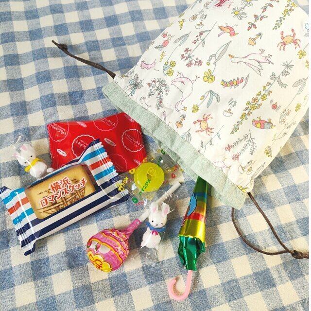 内布からつながった巾着の口の無地カラー布がアクセントに。